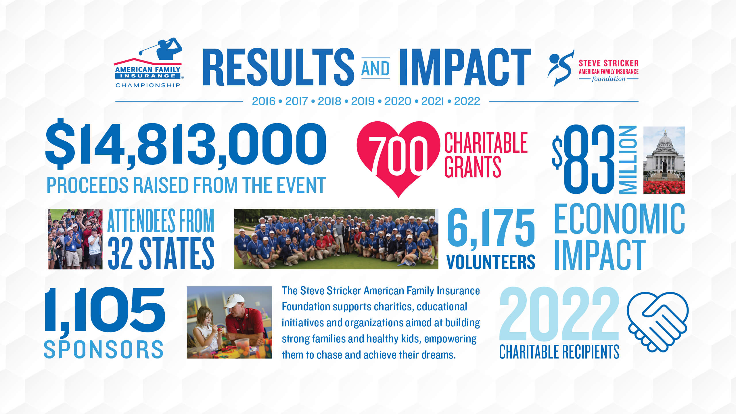 Since 2016, the American Family Insurance Championship has raised more than $15 million for charity. Through the Steve Stricker American Family Insurance Foundation, more than 700 grants have been distributed to organizations that support strong families and healthy kids.